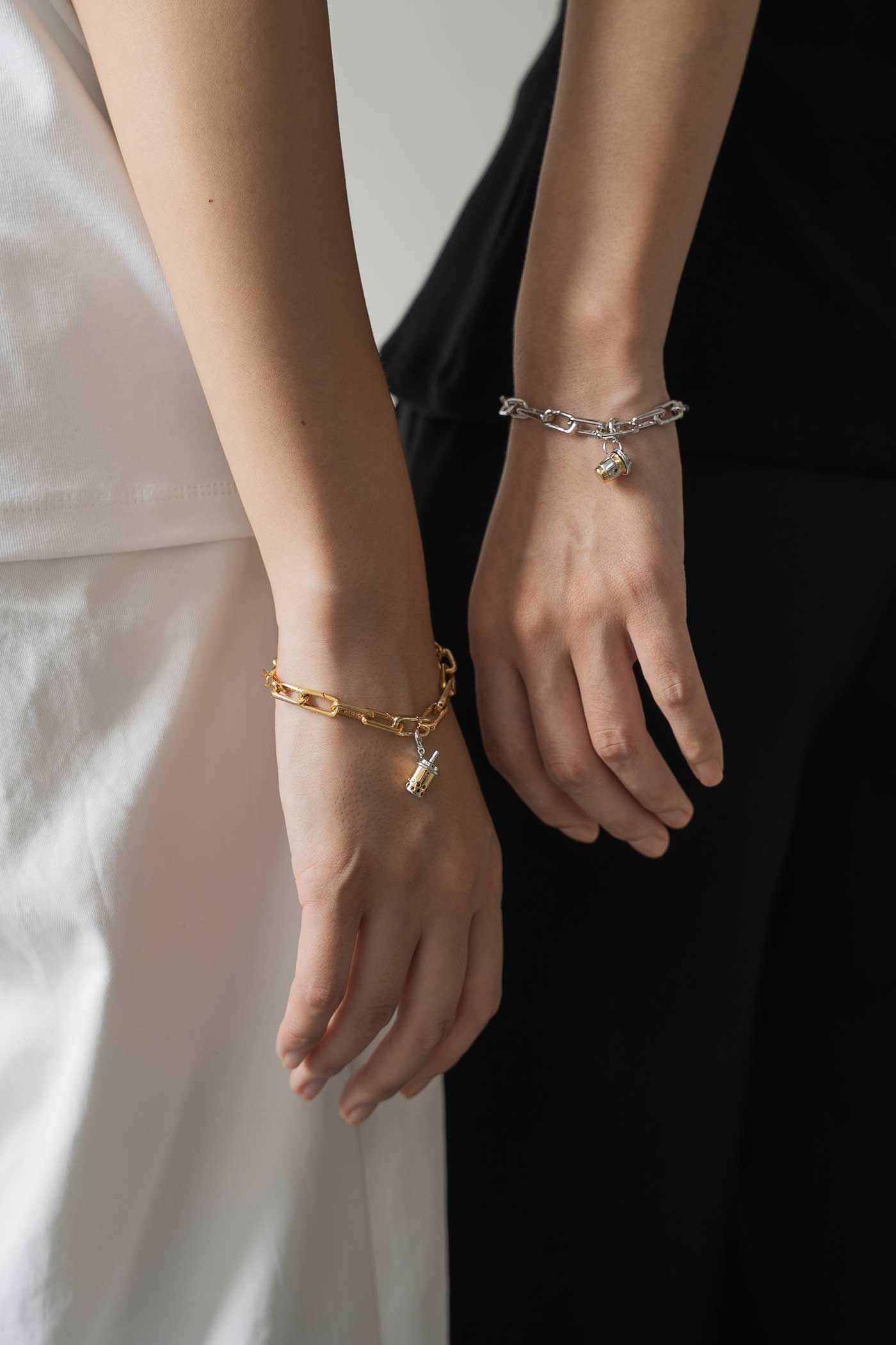 Crafted as petite carabiners, our Muse Links are designed to provide the perfect backdrop for the charms. Link them up to form a bag charm, bracelet, necklace, anything you can think of.